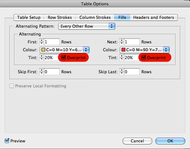 The bottom example is how the table would have likely printed, given that it had fill overprints enabled in the table setup:
