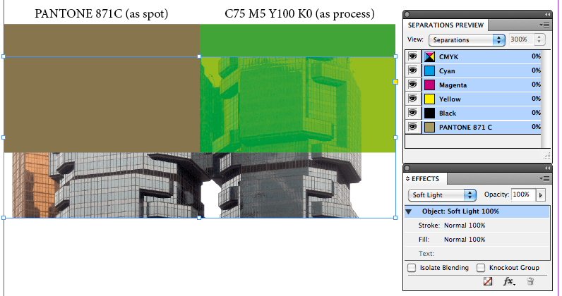 To demonstrate the phenomenon, I have created a new InDesign file with five elements: a rectangle coloured with Pantone 871C; a rectangle coloured with the default green which ships with InDesign; a stock photo with the soft light effect applied , and two captions of the colours in the rectangles. In the before image, the Separations preview is turned off.