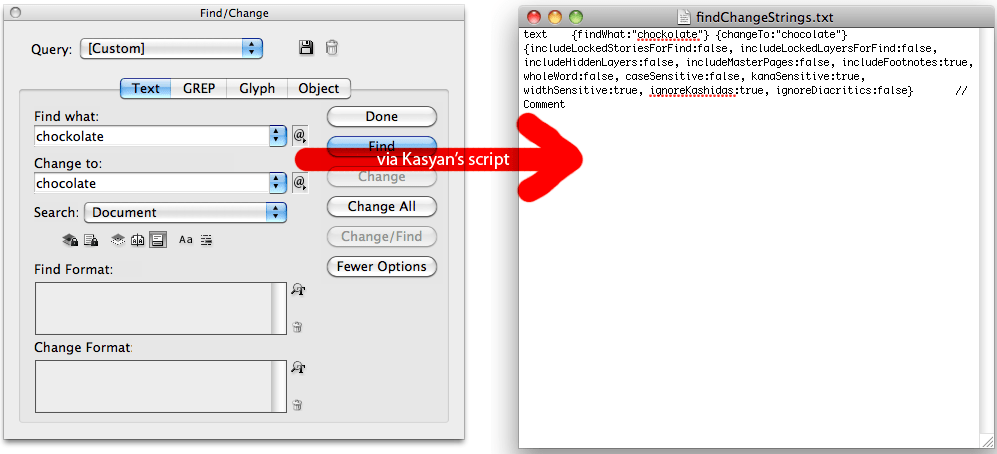 The FindChangeByList script itself hasn’t been improved upon, but the way of entering the find/replace values into the text file where the script gets its values from has. Kasyan Servetsky has a script called Recordfindchange which works by entering the values into the find/replace dialog box, then running the script which creates a text file which can be copied and entered into the text file being referenced by the FindChangeByList.jsx script. Kasyan’s script can be downloaded here.