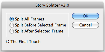 SplitStory again works well but there is just a better version out there by Adi Ravid called StorySplitter which rather than just splitting the stories also has a dialog box with a few options. Again, that script can be found here.