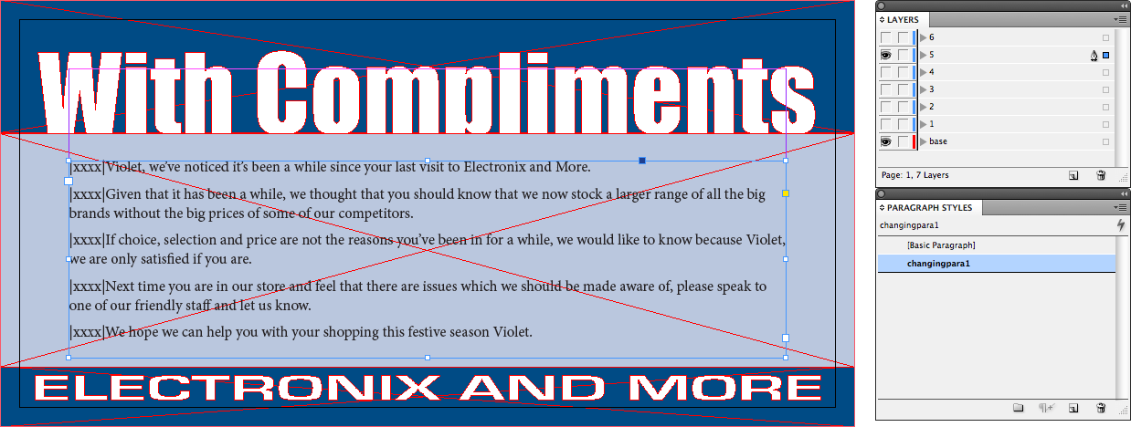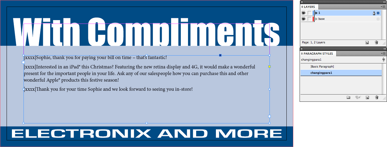 Instead, I have created an InDesign file with two layers – a base with the static data, and then a layer that I have labelled 1 (to represent the good payers). For now, the text for the first campaign is added, along with the letters |xxxx| at the start of each paragraph, and the text is formatted using a paragraph style called changingpara1 – so far, it contains nothing out of the ordinary… yet. This will make more sense soon.