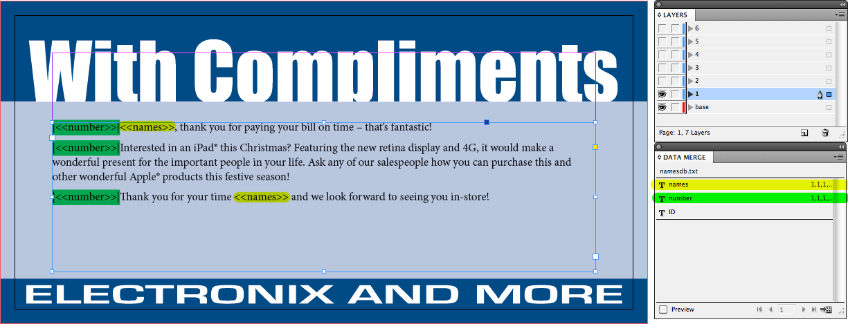 After doing this, make sure all the layers are visible and turn the “preview” on the Data Merge palette. Suddenly, the text seems to come to life, responding to the values in the “numbers” field.