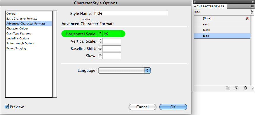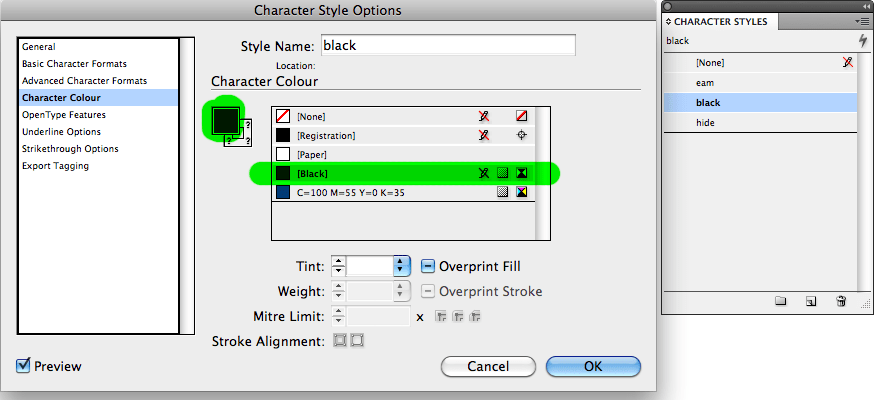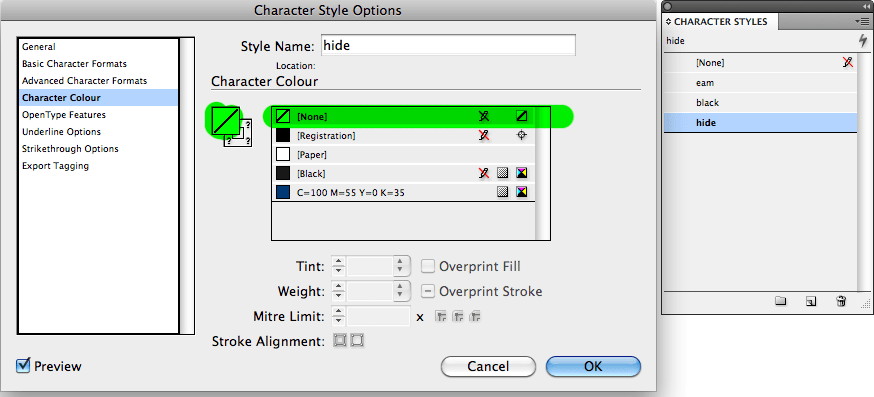 As Heston Blumenthal would say… this is where the magic happens. With no text selected, two character styles need to be created: