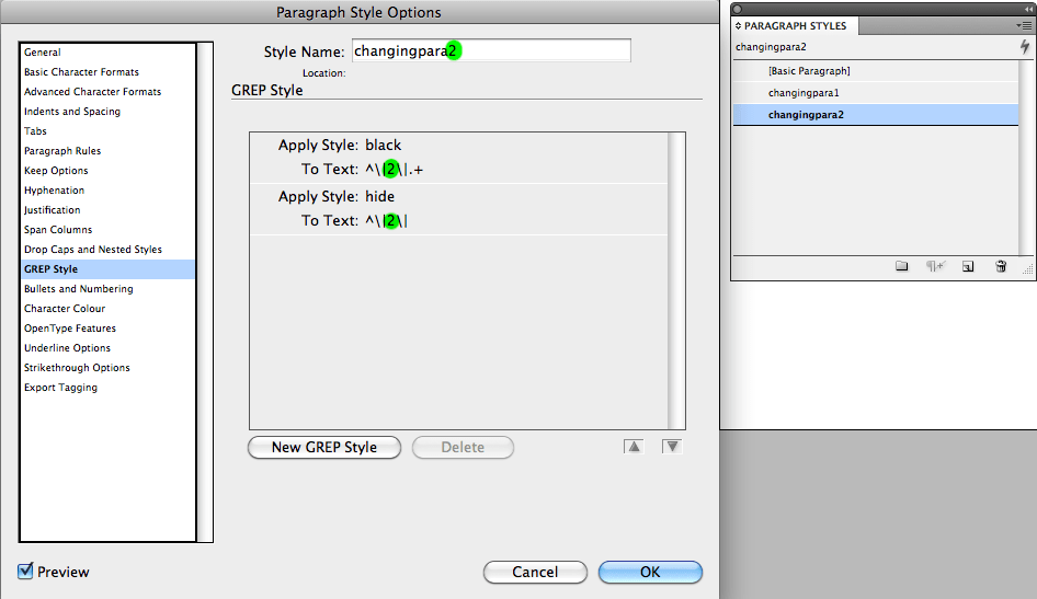But something unexpected has happened… the type has disappeared! This should happen… so far… pushing on, view only layer two, click on the textbox and in the paragraph styles palette, duplicate changingpara1 BUT change its name to changingpara2 and change the GREP styles this way: