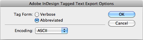 Luckily, all the text for this project, while many pages long, was all in one text frame. This provided the option to enter the index entries while the document was in a raw text format. To do this, the text was exported as an Adobe InDesign tagged text file by placing the cursor anywhere in the text and selecting File/Export (command + E).