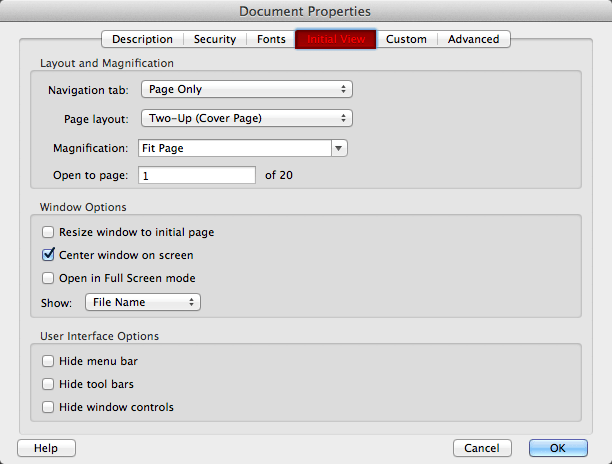 But what cannot be controlled from InDesign is the size and page presentation of the PDF. When viewing a PDF in Adobe Acrobat, the file will appear at the size and presentation options that are in the client’s defaults (from the Preferences/General menu).