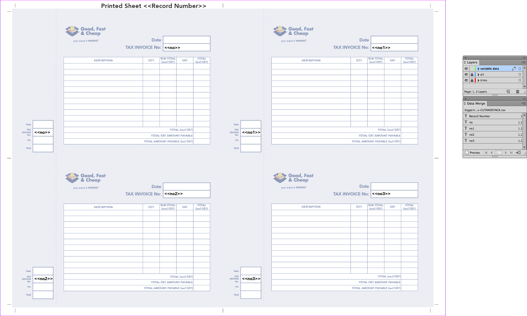 As a regular user of Data Merge, I often have to assemble projects that require cut and stack impositions. Most of the time, I prepare my files one-up at the correct size and output to PDF, knowing that the RIP of the digital printer has imposition software that has the ability to prepare cut and stack style impositions.